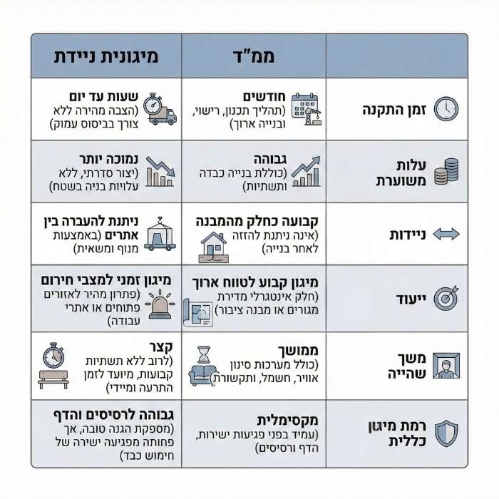 | ייעוד: פתרון זמני, מהיר ונייד | ייעוד: פתרון קבוע וארוך טווח |