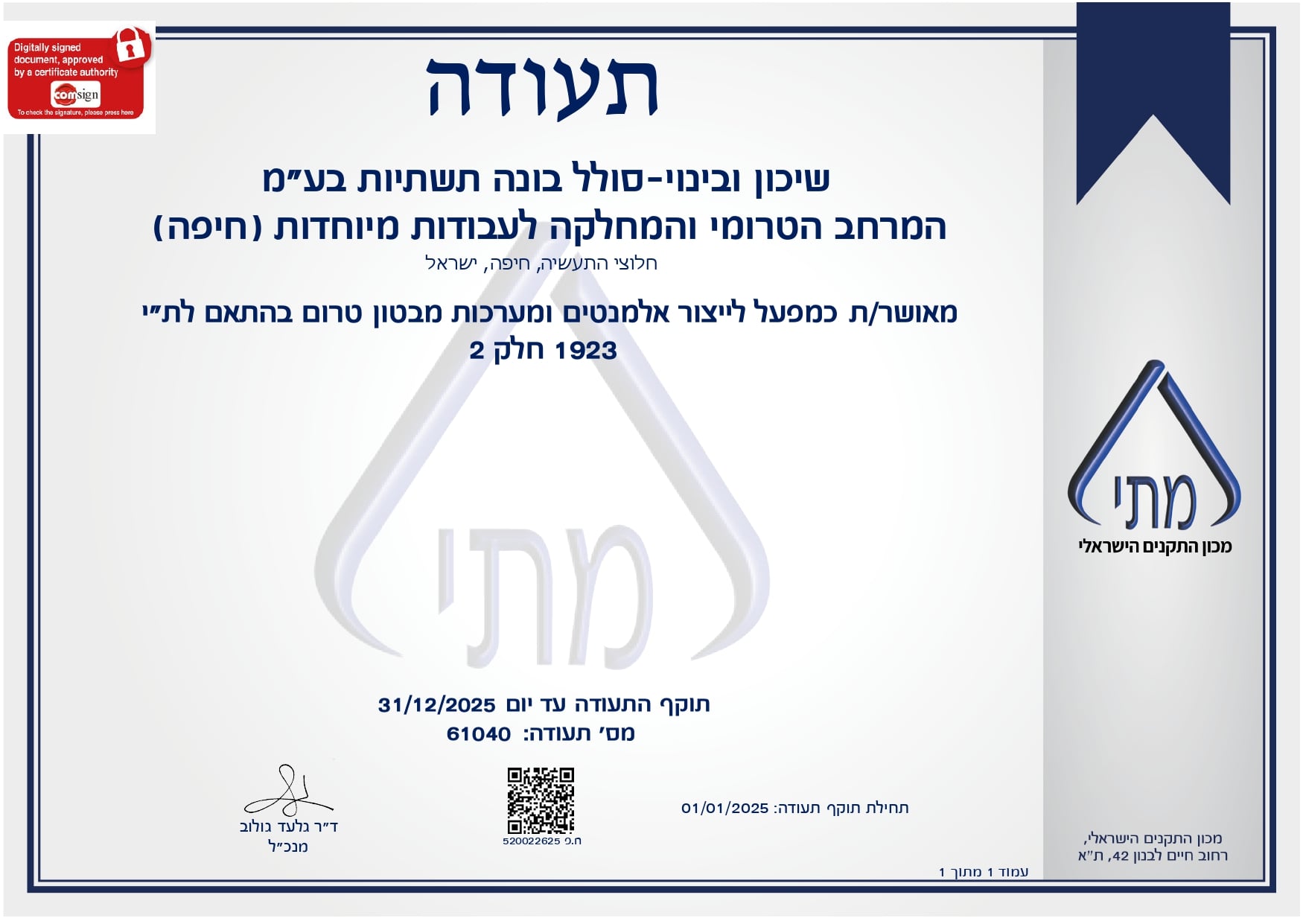 אנו מתמחים בייצור אלמנטים מתועשים לבנייה, תשתיות, גשרים, וקירות קרקע משוריינים: אלמנטים לגשרי מקטעים, לוחות חלולים דרוכים (לוח"דים), אלמנטים מבטון דרוך ובטון לא דרוך ומוצרים שונים לפי דרישה. לעלונים שלנו.